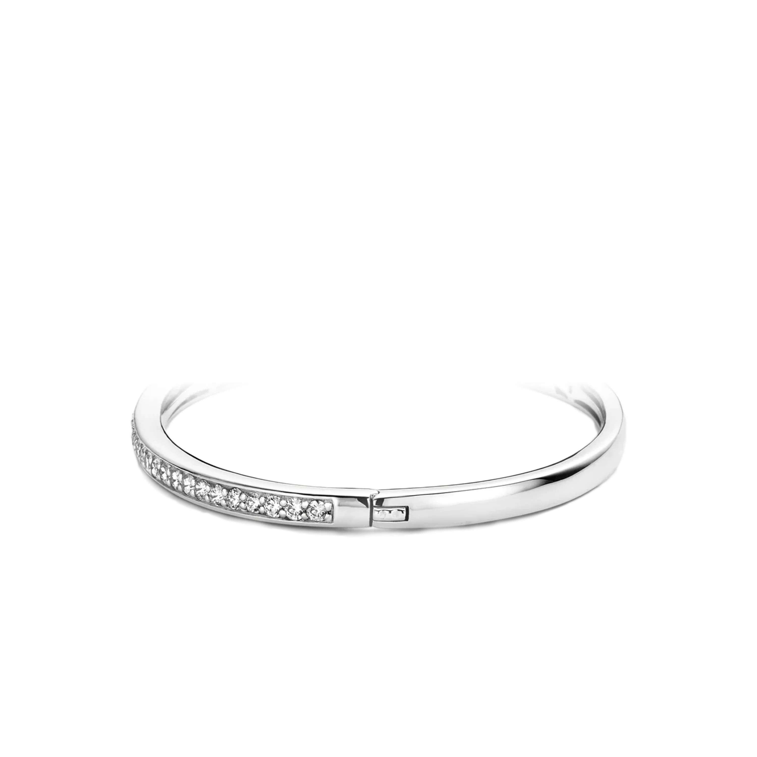 This beautiful TI SENTO bracelet is set with cubic zirconia stones, with riveted accents for a touch of texture. This oval-shaped bracelet is coated with a rhodium finish, giving the sterling silver material extra shine and shimmer, as well as reducing wear and tear. Easy to wear and incredibly comfortable, this bracelet features an integrated hinge and lock fastening. This TI SENTO bracelet also features an incredibly smooth interior, reducing the chance of snagging and discomfort when worn.