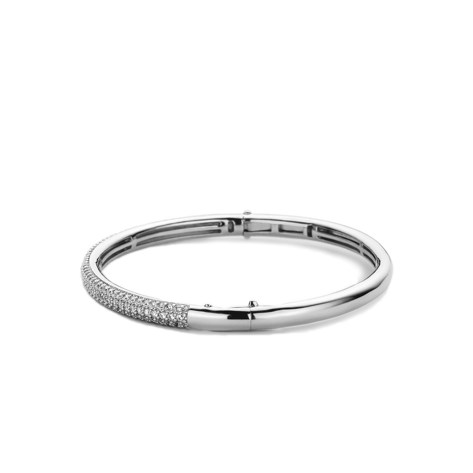 TI SENTO silver bangle. The bracelet is made of rhodium plated silver and is set on the top edge with white zirconias. The bracelet is an ‘Essentiali’ in your jewellery collection; thanks to its versatility, it’s a must-have in every jewellery box. Wear the bracelet on its own as the eye-catcher of your outfit or combine it with a bead bracelet for a trendy look.