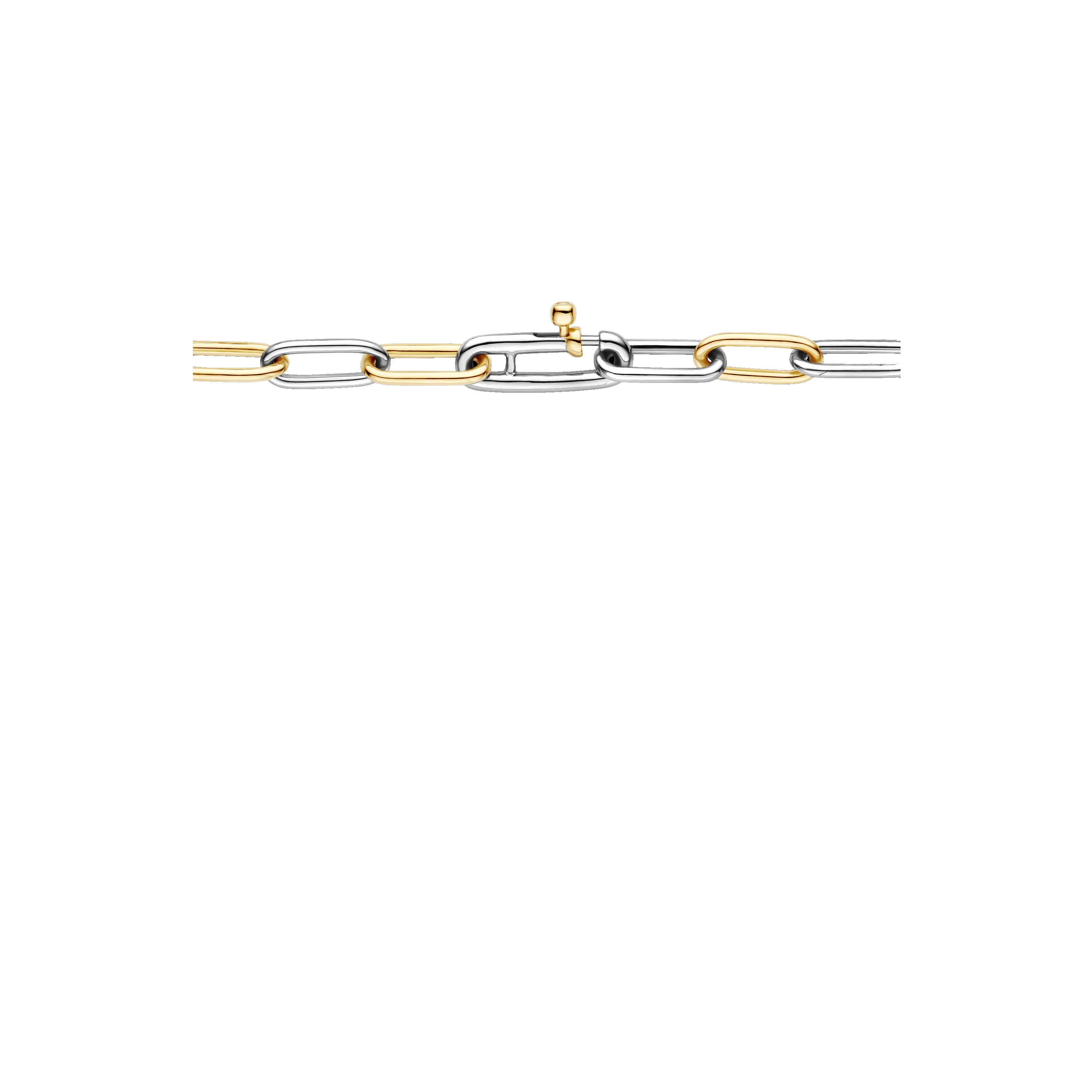 A bold interplay of yellow gold-plated and polished silver links creates a striking bicolour silhouette—distinctive yet effortlessly wearable. Crafted from premium 925 sterling silver, each sculptural link locks into the next in a seamless expression of unity and strength. This statement piece brings an architectural edge to any outfit, whether worn solo or stacked. Finished with a secure safety-lock, it’s nickel-free, hypoallergenic, and designed to stay with you, always.