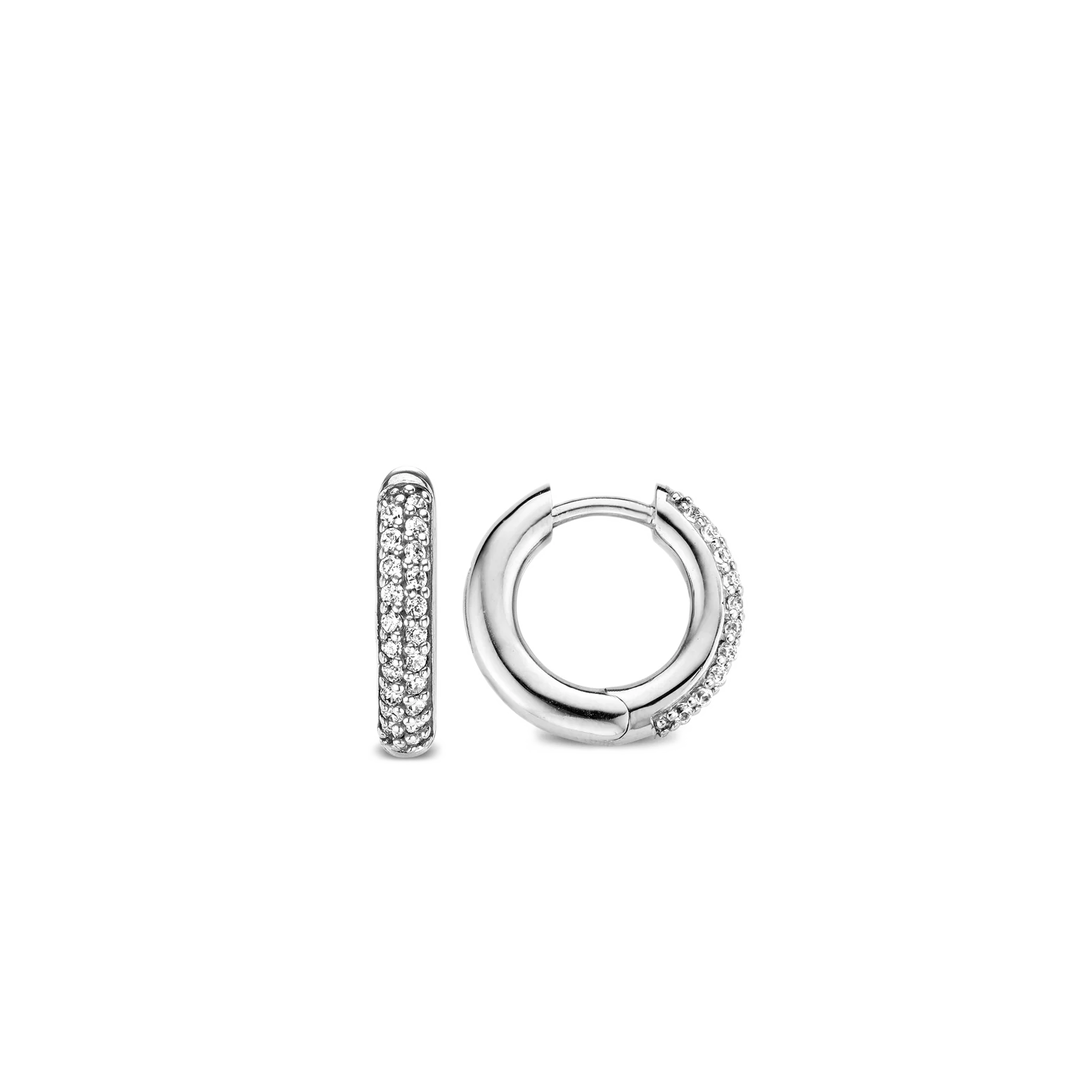 These TI SENTO earrings each have a diameter of 18 mm, and are made from quality rhodium plated sterling silver; they have been designed with two rows of brilliant, neatly-cut cubic zirconias, which have themselves been placed in a channel setting that dominates the front view of the earrings when worn.
