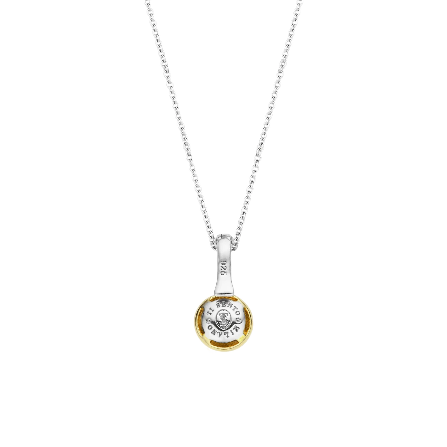 This silver TI SENTO pendant has a large zirconia in the middle, set in a smooth setting that is yellow gold plated with yellow gold. The eye of the pendant is set with smaller brilliant cut zirconias that give the pendant a glamourous appeal and create even more sparkle. The eye of the pendant has a so-called clip-eye - the eye can be clicked open and closed, making it easy to change the pendant or wear it on a necklace with a larger clip ring.