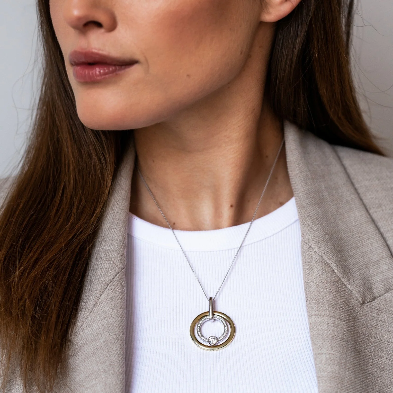 TI SENTO pendant made of rhodium plated sterling silver. This piece consists of two rings, one of which is pavé-set with zirconias. The other is smooth and has gold plating. Thanks to the handy clip-eye you can attach the pendant to a necklace straight away. The piece comes in luxury packaging for safekeeping when you are not wearing it.