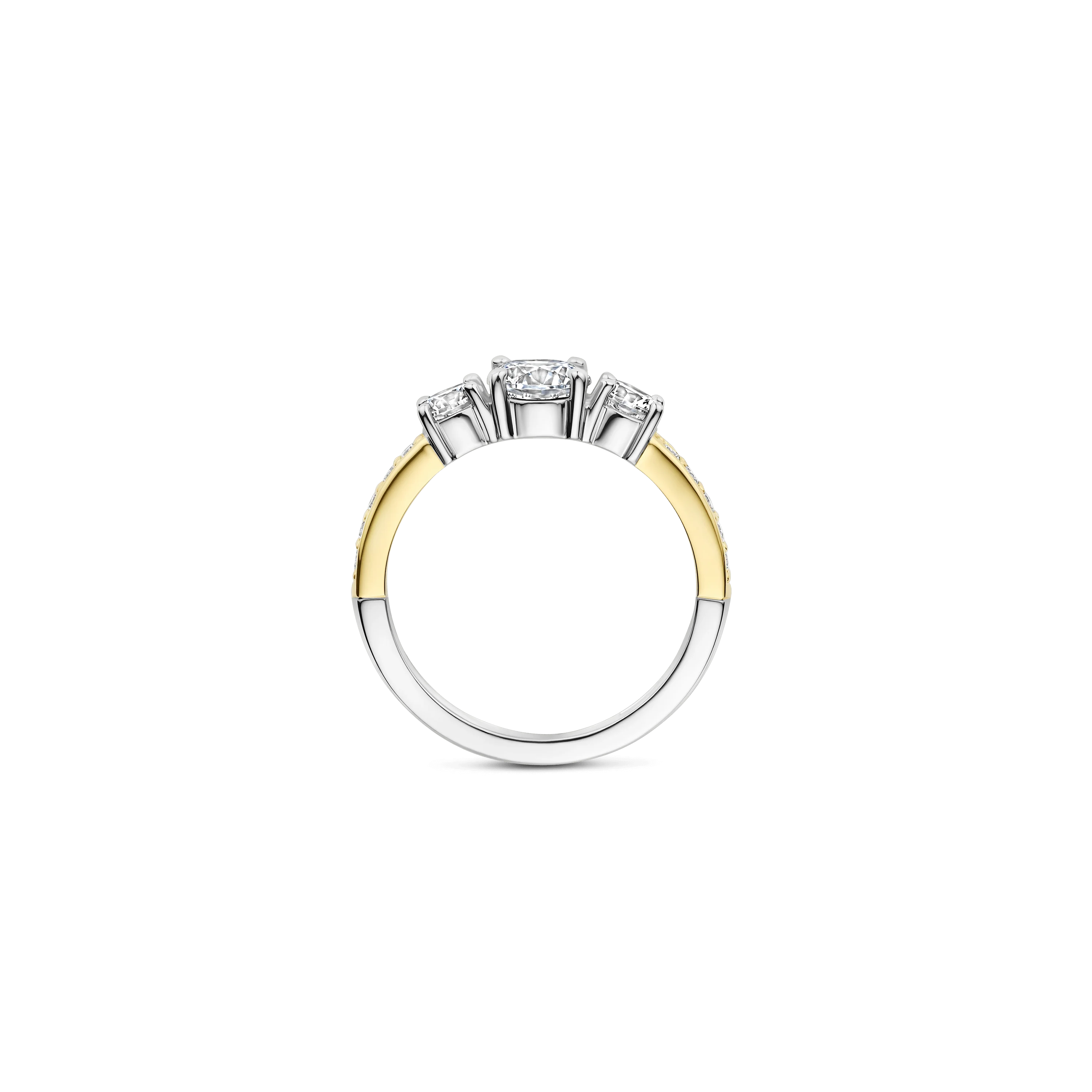 This gold-plated ring with zirconia stones is crafted from high-quality 925 sterling silver and features a refined, layered design. The band is fully set with sparkling zirconia stones, while three larger zirconia stones are placed centrally. This composition creates depth and an elegant play of light, with the central stones subtly enhanced by the shimmering pavé band.