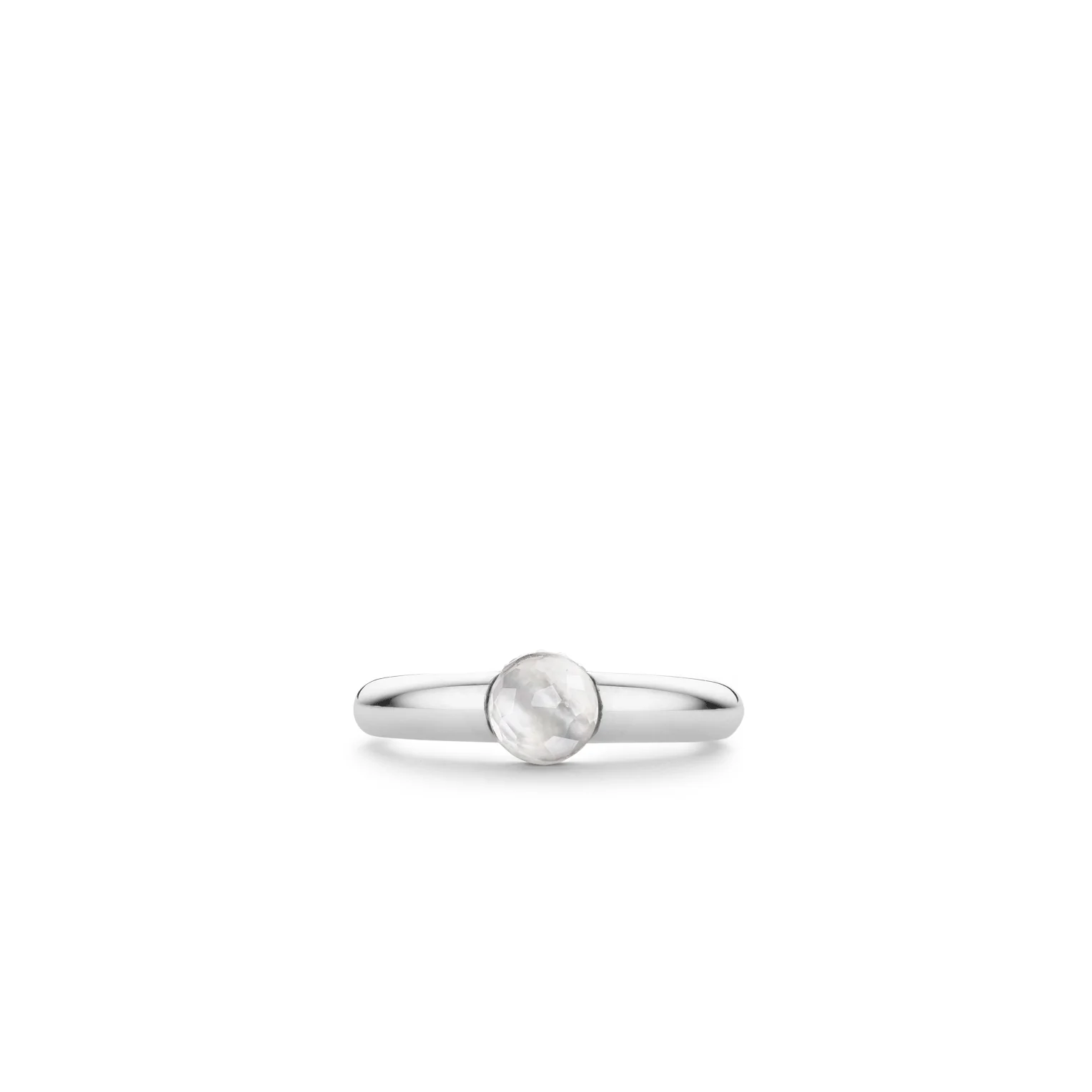 TI SENTO ring made of rhodium plated sterling silver. The ring is set with a milky white faceted crystal. The edge of the ring has a row of pavé-set zirconias that provide extra sparkle.
