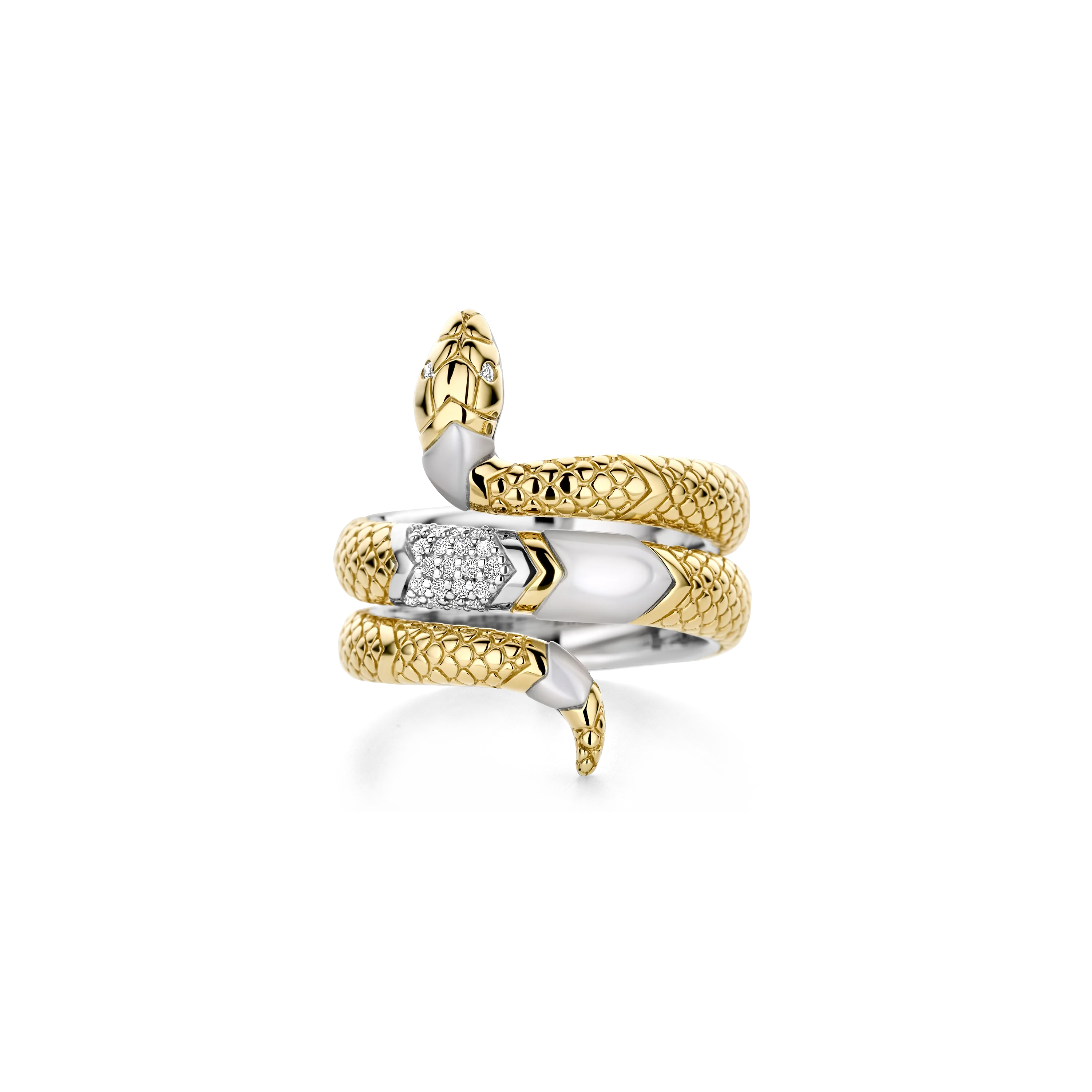Unleash your inner mystique with this TI SENTO gold-plated silver Serpent Ring 12203MW. This captivating piece features an enchanting serpent design, meticulously crafted from 925 sterling silver and plated in yellow gold. The serpent's body is adorned with lustrous mother of pearl and a dazzling pave of cubic zirconia stones, creating a shimmering effect. Its eyes, also crafted from white cubic zirconia, exude an alluring intensity. A symbol of both wisdom and seduction, the serpent is reimagined as a powerful and elegant statement piece. This ring is perfect for the woman who dares to be different. Embrace your inner power with this extraordinary ring. Crafted with care for sensitive skin, this nickel-free and hypoallergenic ring ensures lasting comfort and quality.
