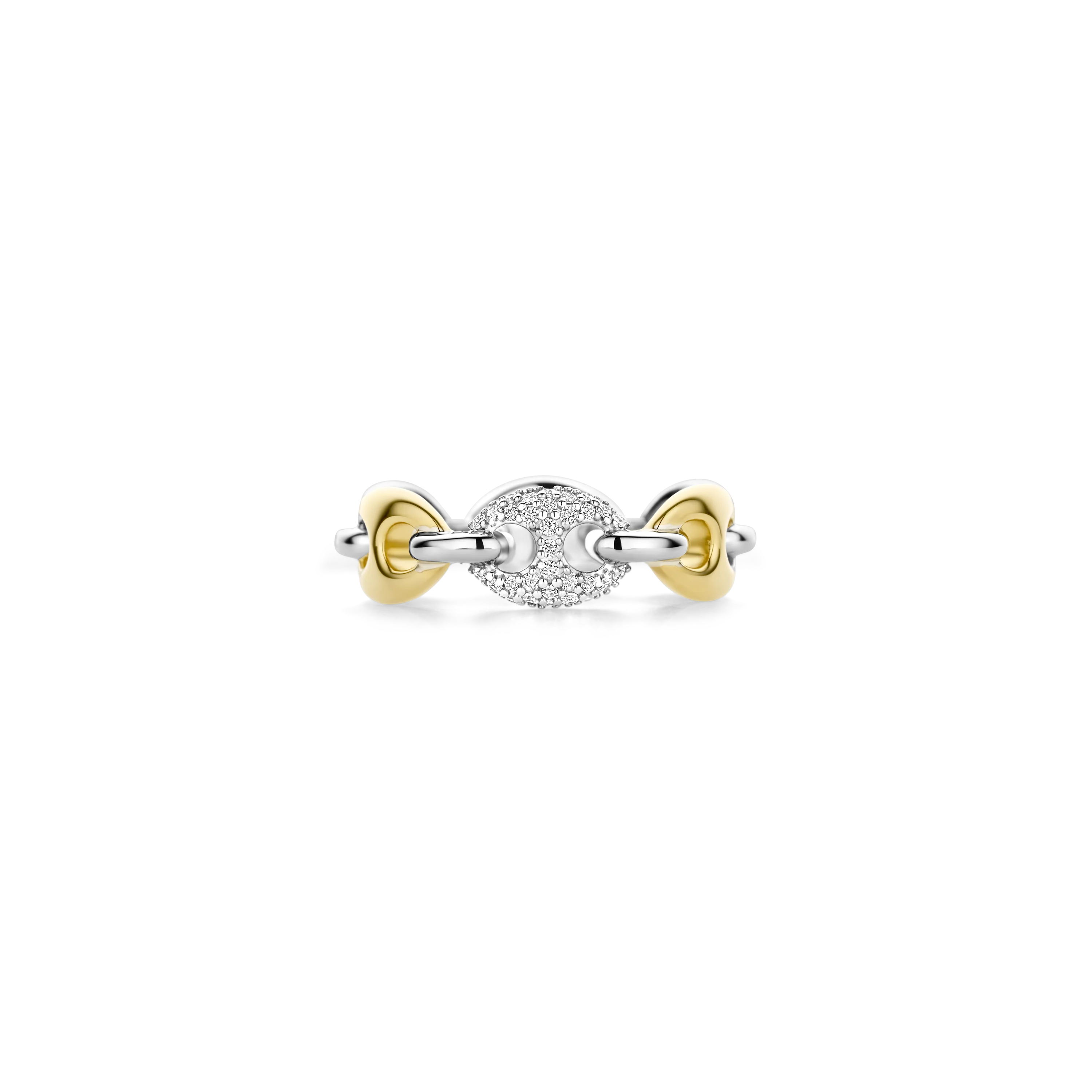 Indulge in timeless elegance with our TI SENTO gold-plated silver Coffee Bean Ring 12256ZY. This unique piece reimagines a classic symbol with a modern twist. Crafted from 925 sterling silver and plated with precious platinum for enduring brilliance, the ring features our iconic coffee bean shapes. Each bean is meticulously crafted: one plated in lustrous yellow gold, another adorned with a sparkling pave of cubic zirconia. A fusion of ancient symbolism and contemporary design, this ring is a statement piece that effortlessly elevates any outfit. The coffee bean, a symbol of energy and nourishment, takes on a new meaning as a symbol of style and sophistication. Let this ring be the focal point of your ensemble. Wear it solo for a bold statement or stack it with other TI SENTO rings to create a personalised look that exudes effortless chic. Crafted with care for sensitive skin, this nickel-free and hypoallergenic ring ensures lasting comfort and quality.