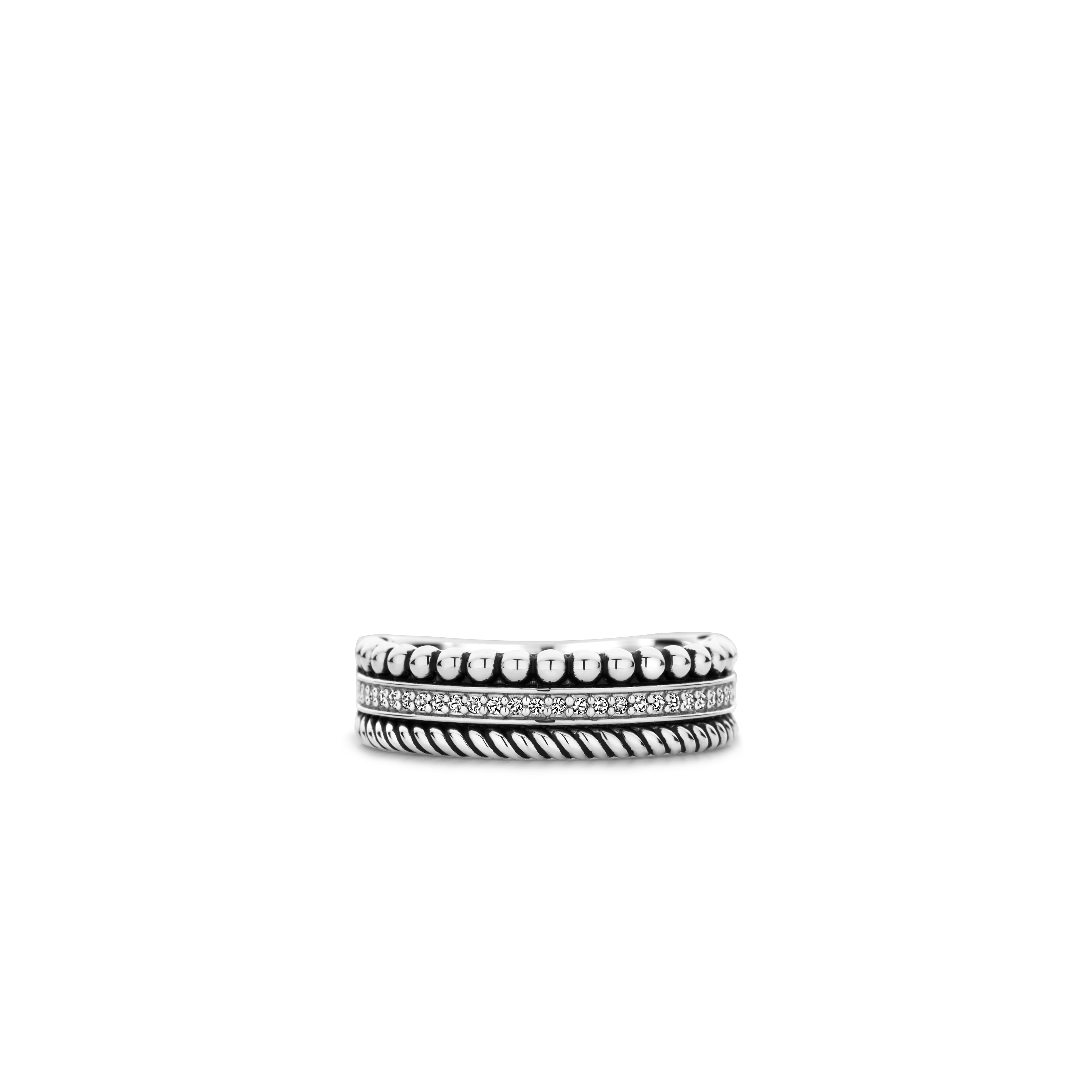 Embrace modern minimalism with this TI SENTO Silver Ring 12342ZI. This bold yet elegant piece features three distinct bands creating a captivating design. One band boasts a playful bubble structure, the middle band is adorned with a dazzling pave of cubic zirconia stones while the third band features an intertwined design showcasing the artistry of the piece. Crafted from 925 sterling silver and plated with platinum for lasting brilliance, this ring is a testament to avant-garde contemporary fashion. This ring is a celebration of contrasts and textures, offering a unique and striking statement. Its versatile design allows it to seamlessly transition from day to night. Elevate your everyday look with this glamorous piece. Crafted with care for sensitive skin, this nickel-free and hypoallergenic ring ensures lasting comfort and quality.