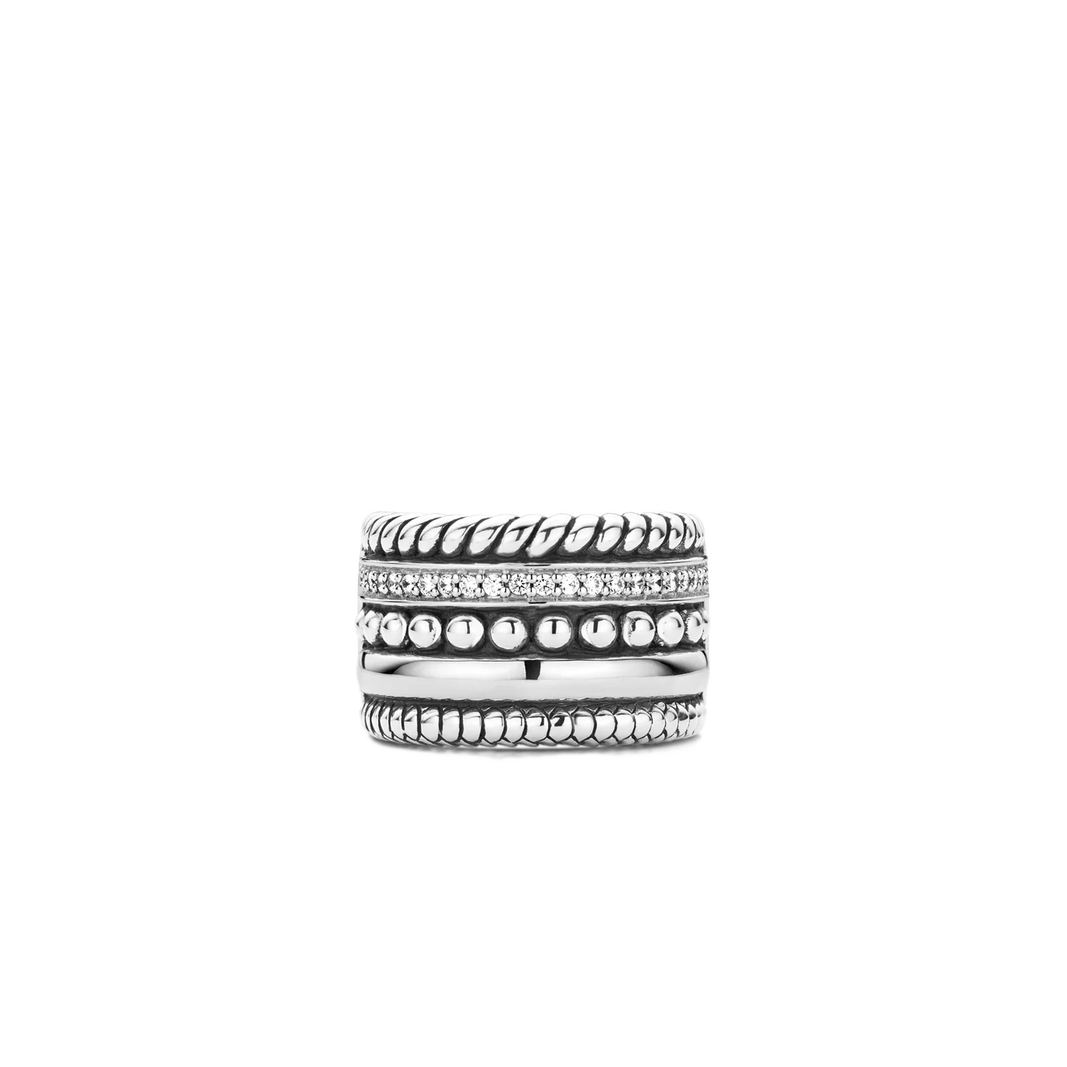 Inspired by various white gold pieces from the TI SENTO collection, this ring combines several designs in one. A variety of textures, patterns and structures lend this ring a look of rugged sophistication, making it one of the most popular pieces of jewellery in the collection. Crafted from durable rhodium sterling silver, this ring will resist scuffs and damage and maintain its shine over time.
